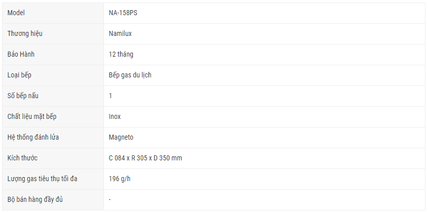 Hãng Namiux với nhiều năm kinh nghiệm đang được ưa chuộng, tin cậy trên thị trường trong nước và quốc tế ngày nay đã không ngừng vươn lên và cho ra đời nhiều dòng sản phẩm đáng tin cậy phục vụ nhu cầu người tiêu dùng trên khắp mọi miền đất nước. Bếp ga du lịch Namilux NA-158PS là một trong những dòng sản phẩm chất lượng cao của hãng Namilux.