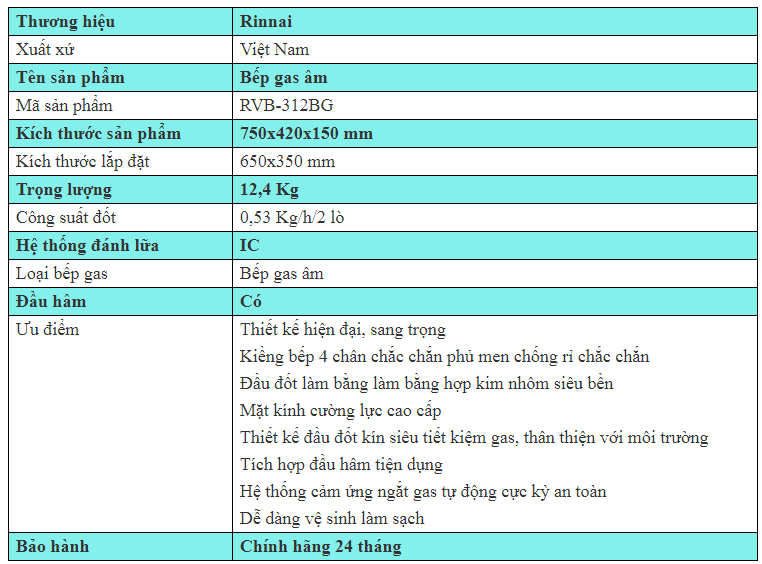 BẾP GAS ÂM RINNAI RVB-312BG là một sản phẩm mới trong dòng bếp gas âm của Rinnai, với thiết kế 3 lò nấu chuyên dụng cùng kích thước lắp đặt nhỏ gọn chỉ 650x350 mm, tuy nhiên nếu không muốn lắp đặt âm bạn hoàn toàn có thể đặt bếp trên bàn để sử dụng nhờ có 4 chân vững vàng và chắc chắn. Bếp sử dụng công nghệ đầu đốt kín làm bằng hợp kim nhôm có thể tiêu thụ 100% nhiên liệu, hoàn toàn không có lượng gas dư thoát ra ngoài cực kỳ an toàn, thân thiện với môi trường sống và giúp tiết kiệm tối đa chi phí sinh hoạt hàng tháng cho gia đình bạn.