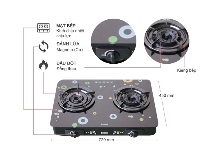 Đầu đốt bằng đồng thau tiên tiến bền bỉ, bếp gas cho ngọn lửa phân bố đều và rộng, tiết kiệm gas, giúp giảm chi tiêu.