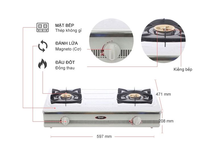 Bếp gas trang bị đánh lửa cơ học Magneto, đầu đốt bằng đồng thau, đầu hâm với lượng gas tiêu thụ 0.62 kg/h. Công nghệ đầu đốt thế hệ mới tiết kiệm gas.