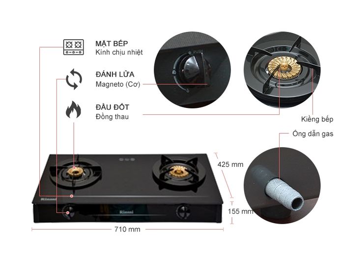 Bếp gas Rinnai có thiết kế tiện lợi với 2 bếp, mặt bếp bằng kính sáng bóng, hạn chế bám bẩn tốt cũng thuận tiện cho người dùng khi vệ sinh